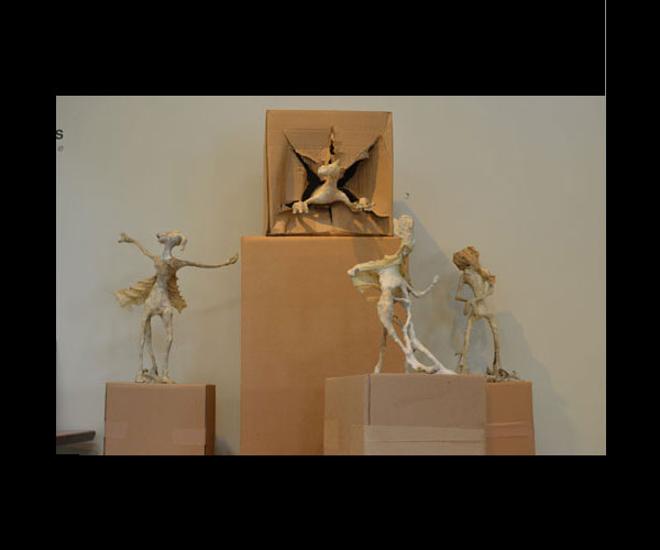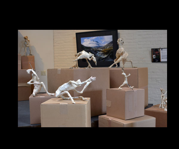In September 2013, it was invited as the featured visual artwork at the Burlington Book Festival, exhibited at Arts Riot on Pine Street in Burlington. Here, the now forty sculptures were set on cardboard boxes, their own packing crates, which angled across the industrial space from the stage to the entry. The first small Red Guys (working title) joined the Parade, moving down from their hanging nest.