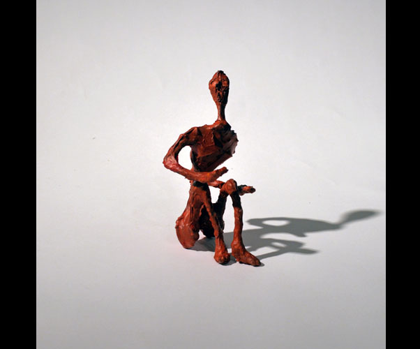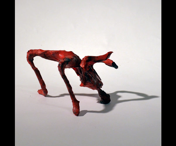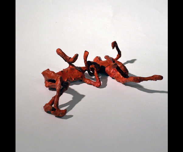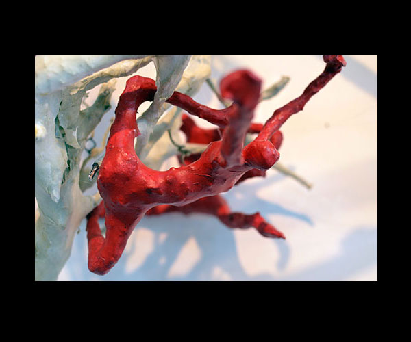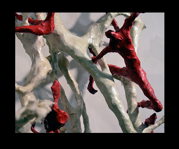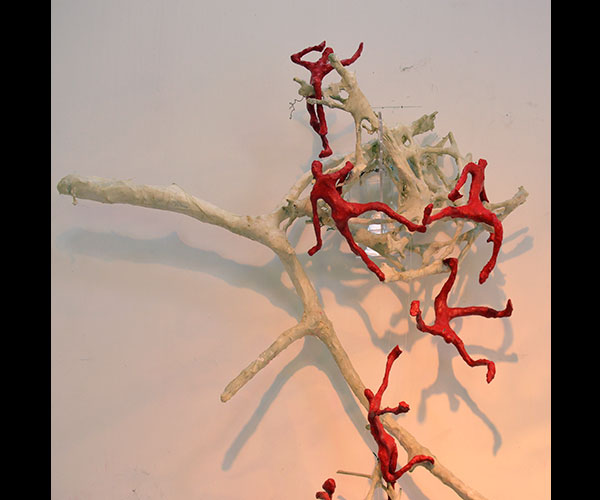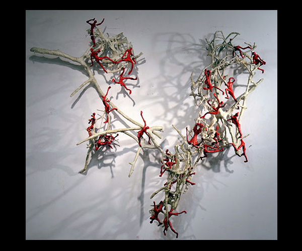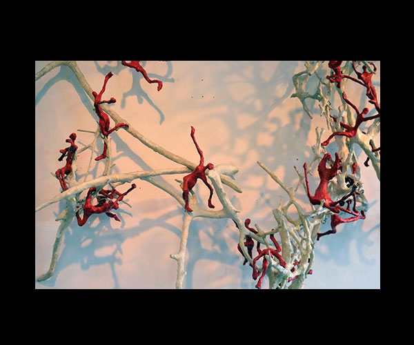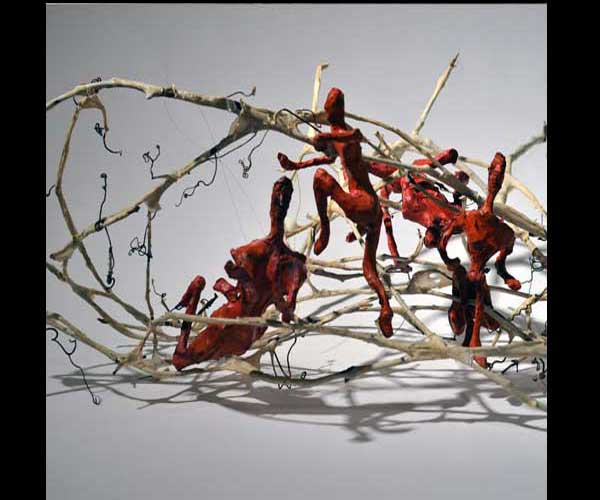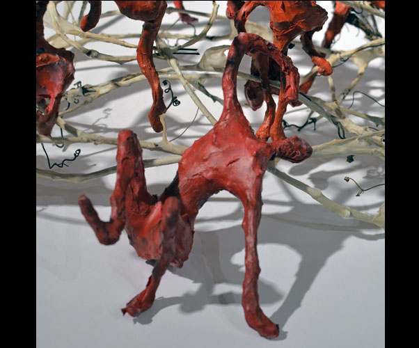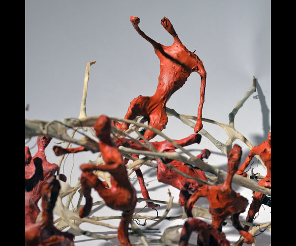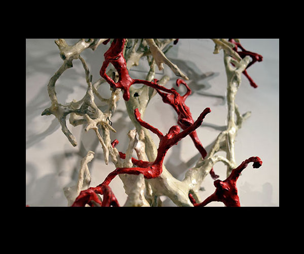 Fifty 6 inch gestural, faceless figures constructed from sculpture wire, resins and covered with skins of red pigmented paper. They move around paper covered branches.