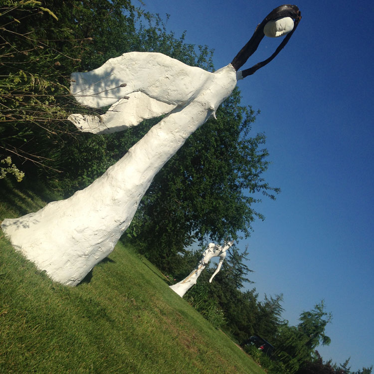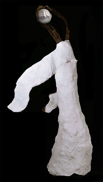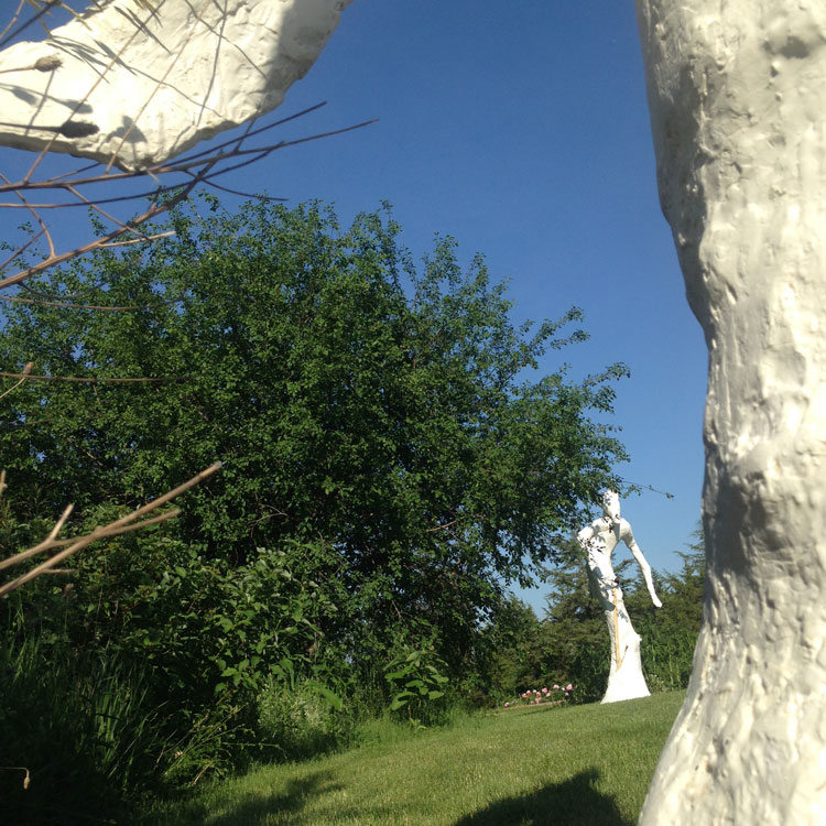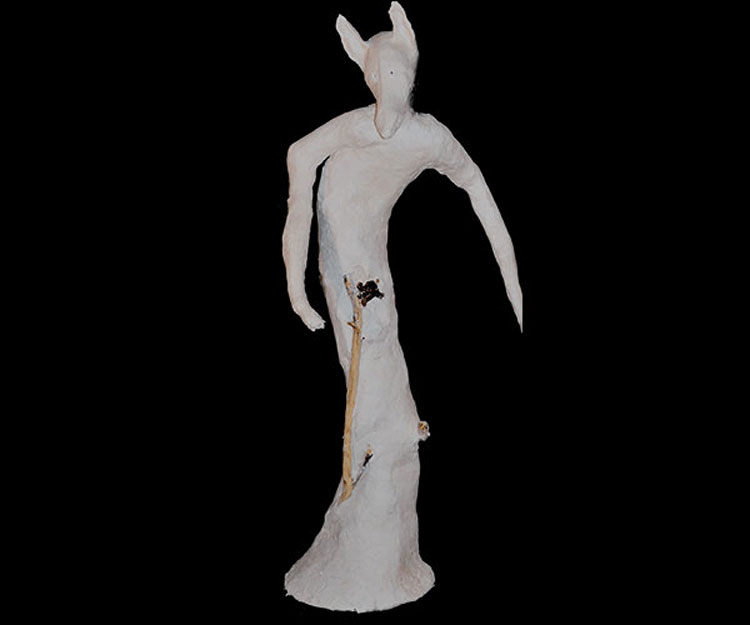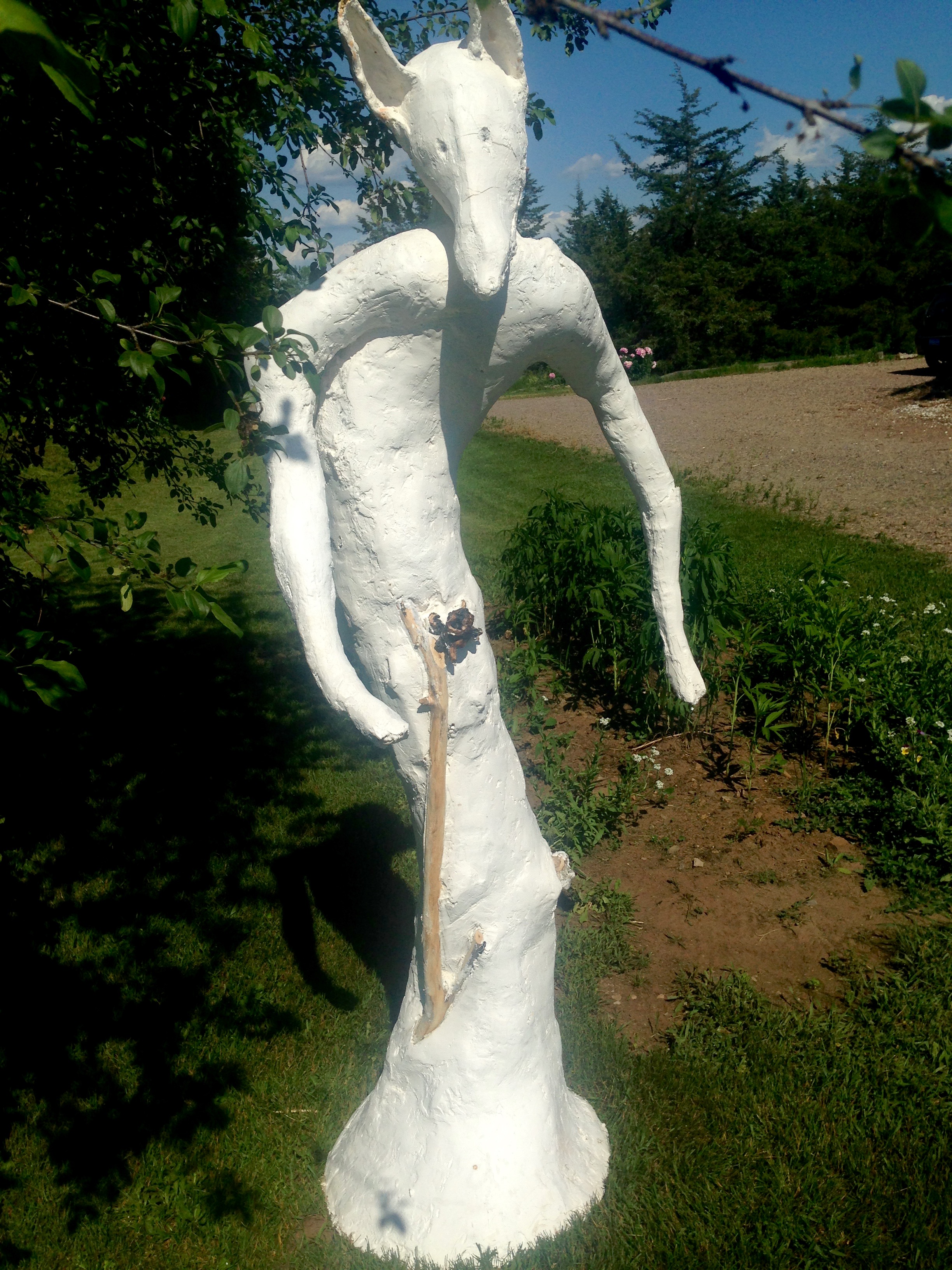 Two six ft tall figures, one three foot tall animal with a driftwood head.