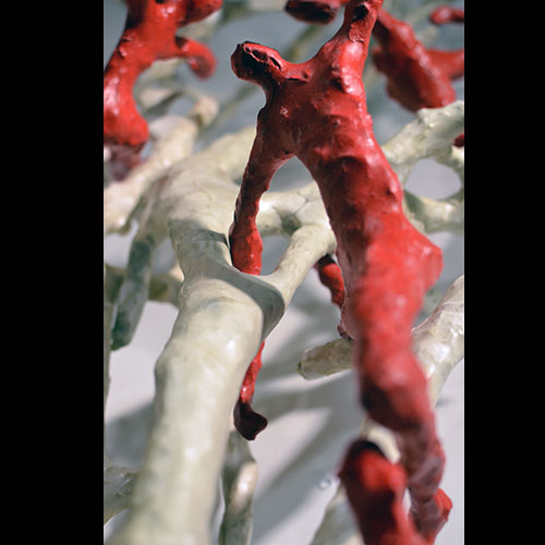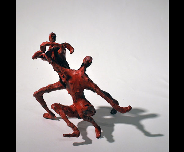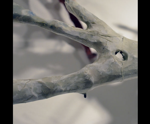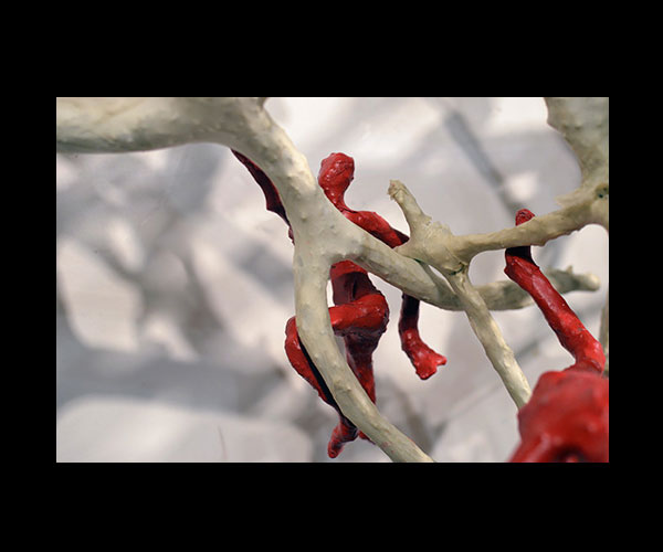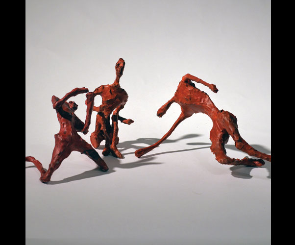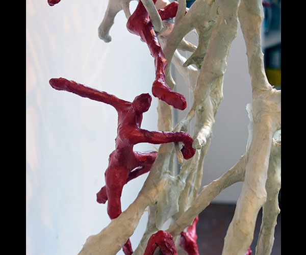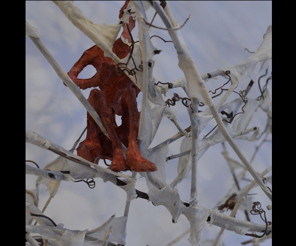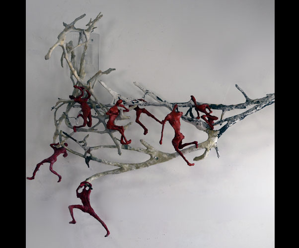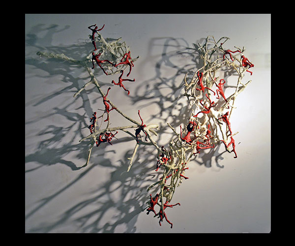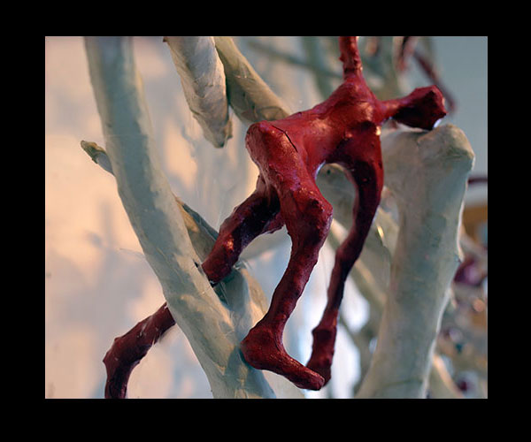 Fifty 6 inch gestural, faceless figures constructed from sculpture wire, resins and covered with skins of red pigmented paper. They move around paper covered branches.