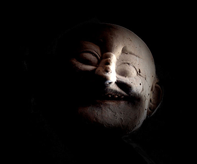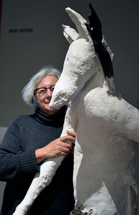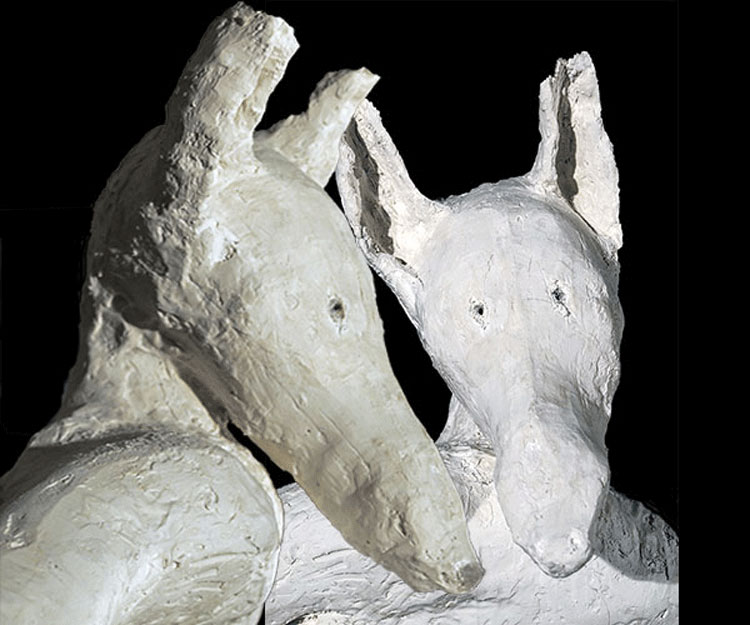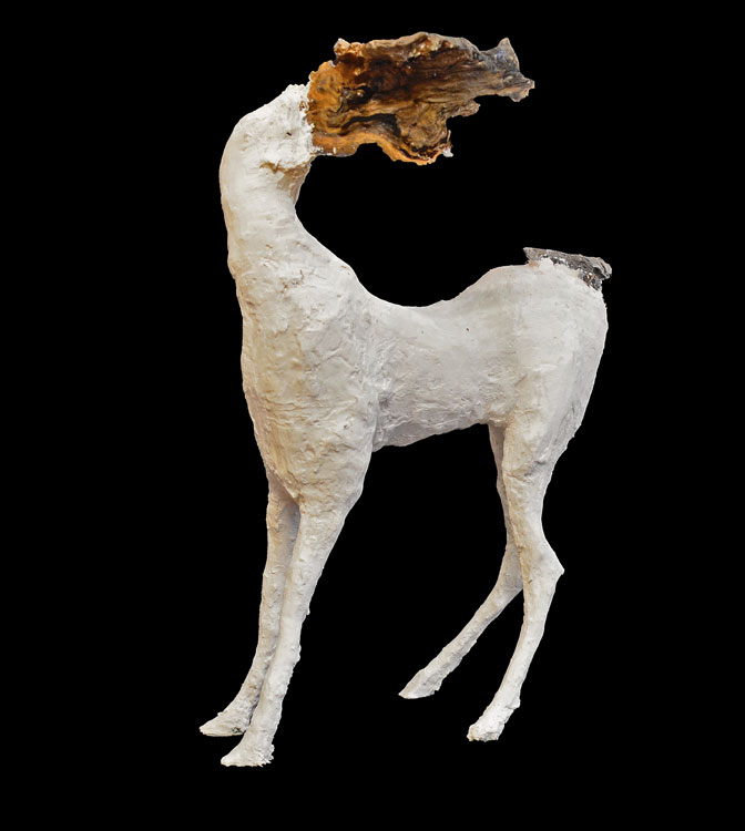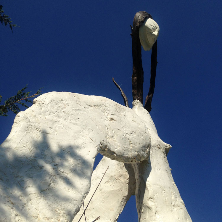 Two six ft tall figures, one three foot tall animal with a driftwood head.